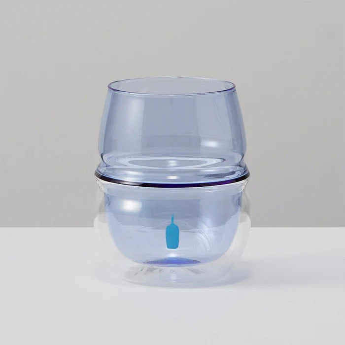 This double-walled glass features a blue and clear bicolor design that allows your drink to float beautifully.